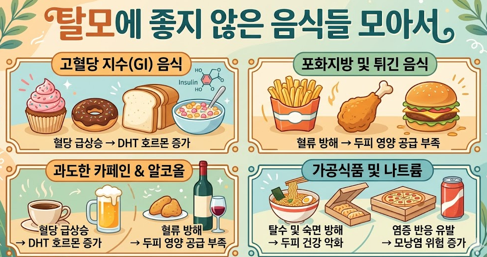 탈모는 두피의 혈류 흐름 및 호르몬 균형과 직결됩니다. 다음 음식들은 모낭 건강을 해치는 주범입니다.